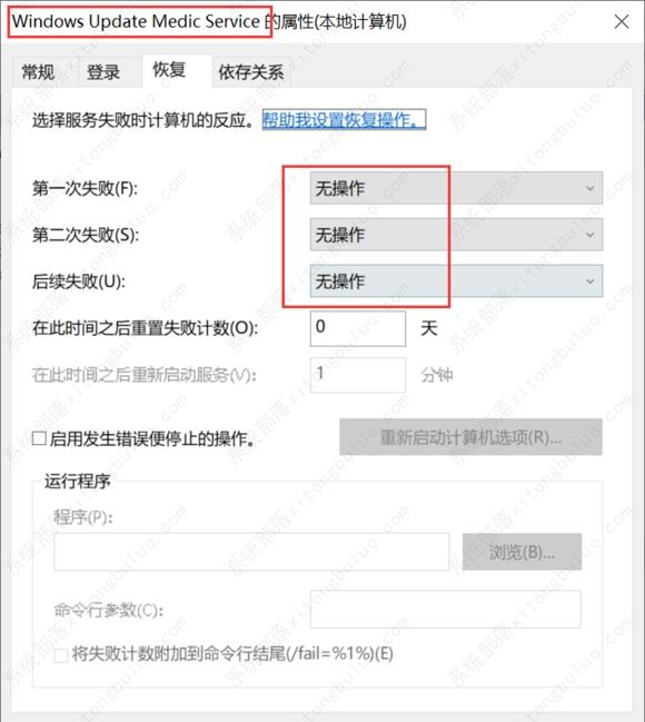 5、“服务“中找到Windows Update Medic Service服务,切换到“恢复”页签,可以看到该服务已被禁止,且三次失败后的动作皆为“无操作”。