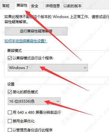 兼容性选择win7,xp都行,简化16位色,高dpi禁用缩放,管理员运行都点上。