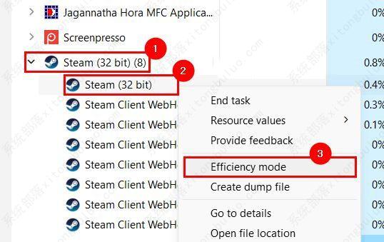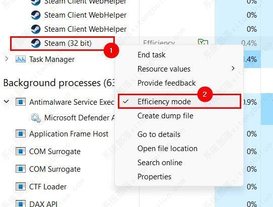 第 11 步:随后,右键点击开启效率模式的进程,再从前后文菜单中点击一次效率模式,如图所示。