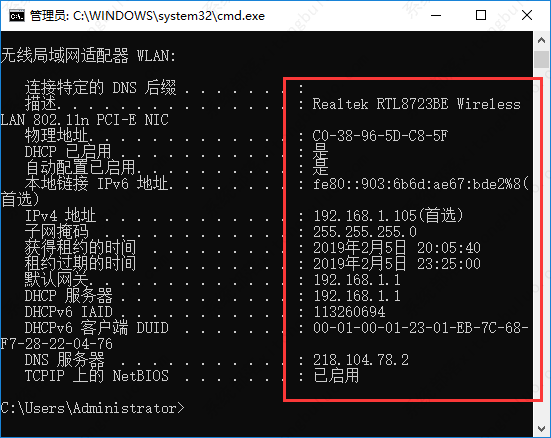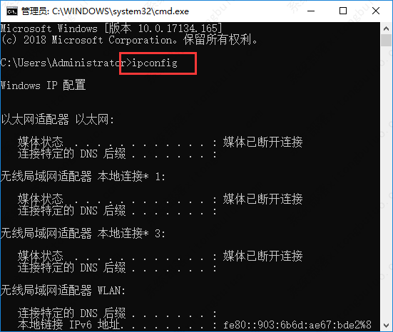 2、输入ipconfig,查看网卡的ip地址,不显示mac地址。如图所示: