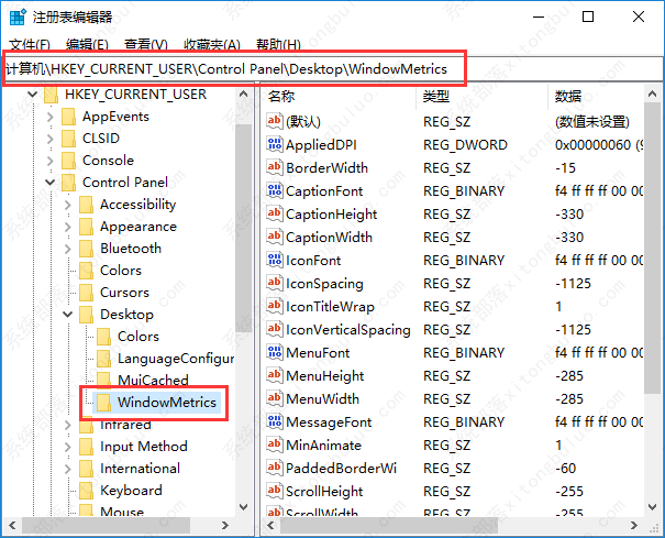 2、在打开的Windows注册表窗口中,定位到HKEY_CURRENT_USERControl PanelDesktopWindowMetrics注册表项;