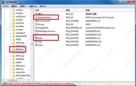 2、进入“注册表编辑器”窗口后,在左侧依次进入“HKEY_LOCAL_MACHINE\SYSTEM\CurrentControlSet\services\Ndisuio”,在右侧中找到“DisplayName”字符串值和“Start”DWORD值,没有的话自己新建。