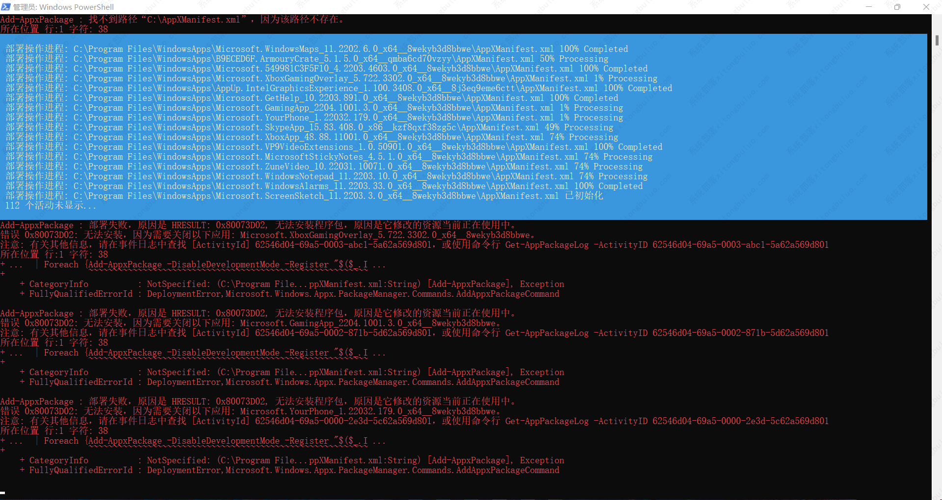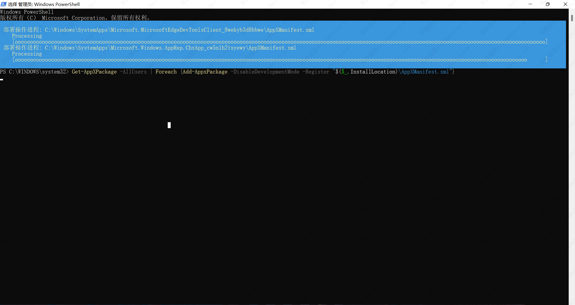 Get-AppXPackage -AllUsers | Foreach {Add-AppxPackage -DisableDevelopmentMode -Register “$($_.InstallLocation)\AppXManifest.xml”}