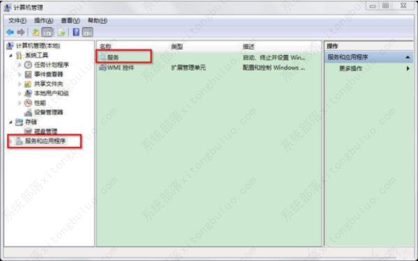 2、在“计算机管理”界面,点击“服务和应用程序”,在中间部分,我们就能看到“服务”选项,双击即可打开服务界面。如图所示: