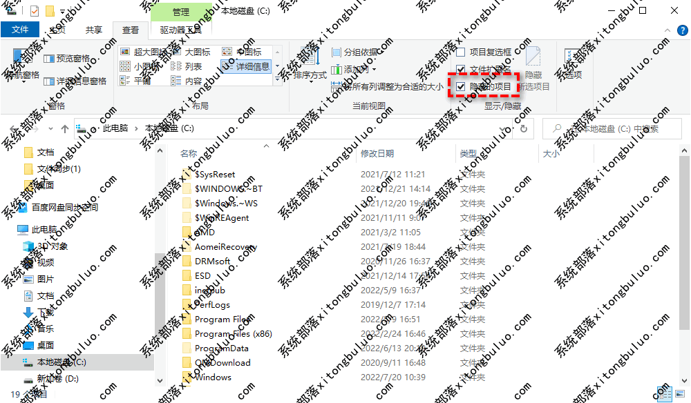 步骤1. 打开文件资源管理器,在C盘中点击“查看”,在下拉菜单中勾选“隐藏的项目”选项。