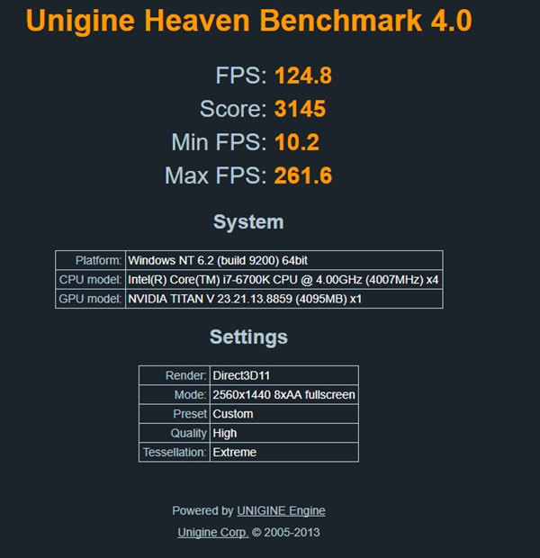 Unigine Heaven 1440P分辨率的得分是3145分,平均帧数125FPS。