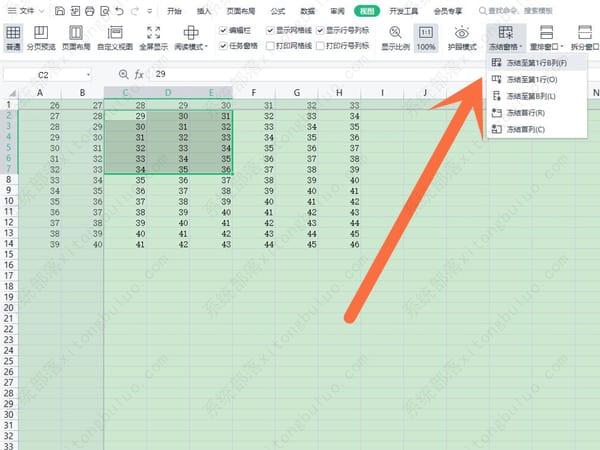 2、然后视图选项下点击冻结窗格,选择需要冻结的区域即可。
