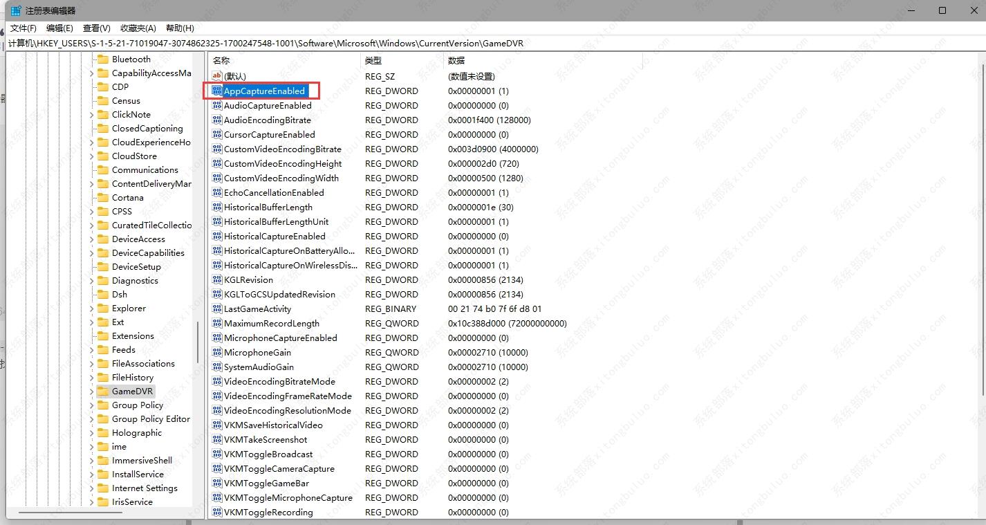 2、将目录依次展开至HKEY_USERS\S-1-5-21-71019047-3074862325-1700247548-1001\Software\Microsoft\Windows\CurrentVersion\GameDVR并在右侧找到AppCaptureEnabled。