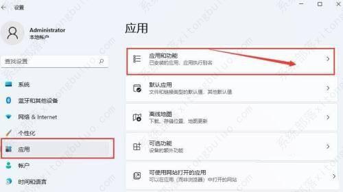 2、随后,打开设置面板的应用栏目,点击应用和功能选项。