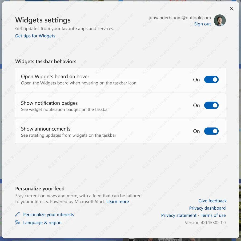 作为小部件体验的一部分,微软将小部件选择器和设置分开。从此航班开始,您需要单击加号 (+) 按钮以添加更多小部件。如果要更改设置,现在必须单击配置文件按钮。在设置页面上,您可以在将鼠标悬停在任务栏中的小部件图标上时禁用小部件仪表板自动打开。此外,您可以控制通知标记以及任务栏图标是否应显示天气信息。