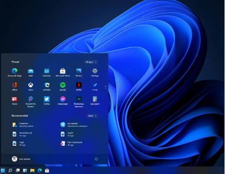2、在设计方面,win11系统将原来位于左下角的“开始”等功能键移到了控制栏中心,同时取消了win10上面原来好用的动态磁贴,所有的窗口基本上都进行了全圆角设计,看上去比较有特色。