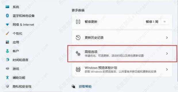2、然后,点击左侧Windows更新,再点击右侧高级选项。