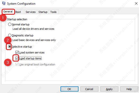 第 3 步:在“常规”选项卡下,通过单击旁边的单选按钮选择选择性启动。