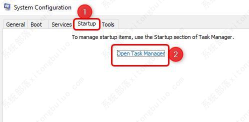 第 7 步:选择启动选项卡,然后单击打开任务管理器,这将打开任务管理器窗口。