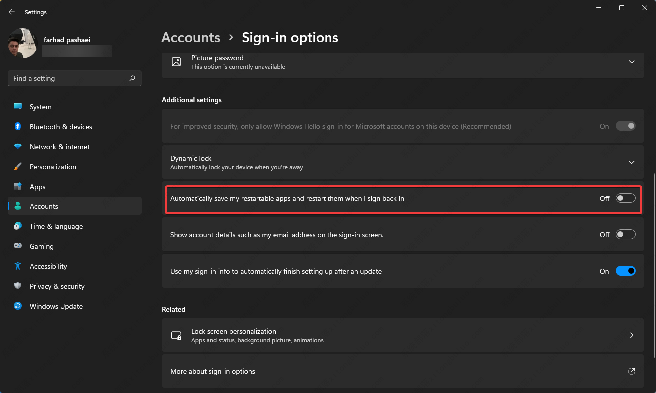现在,禁用 自动保存我的可重启应用程序并在我重新登录时重启它们。