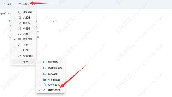 6、如果其中没有,就在“查看”的“显示”选项里勾选上“隐藏的项目”。
