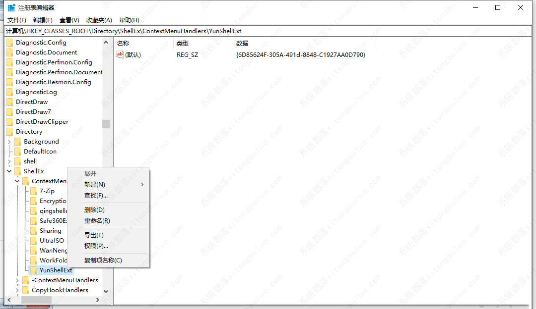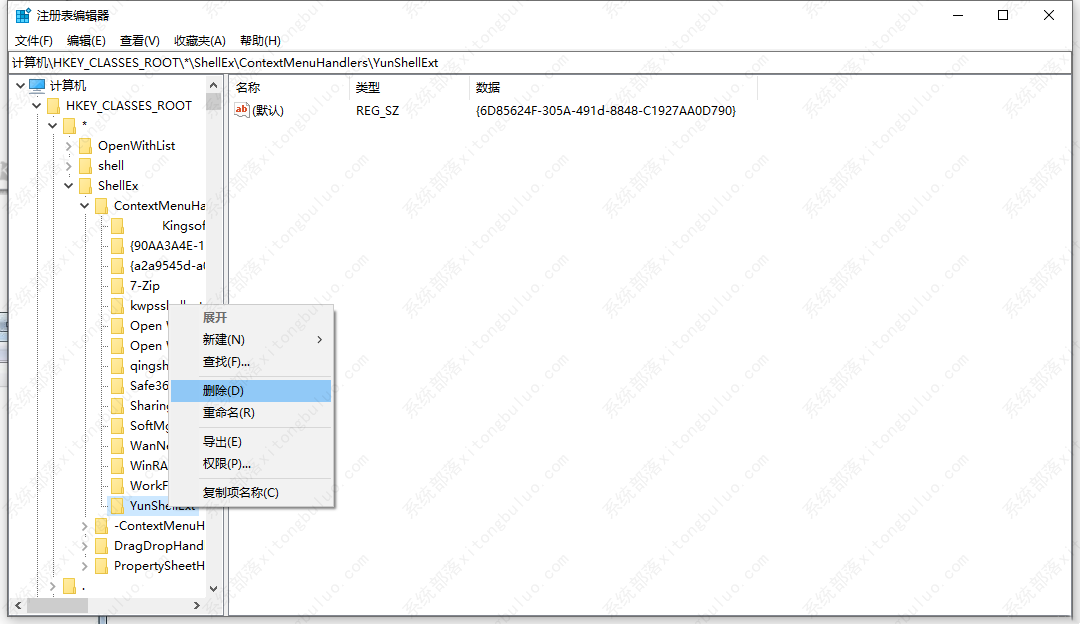 然后再找到:计算机\HKEY_CLASSES_ROOT\*\shellex\ContextMenuHandlers\YunShellExt