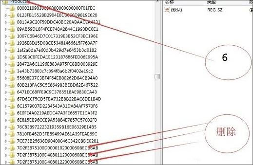 4、最后展开:HKEY_LOCAL_MACHINESOFTWAREClassesInstallerproducts ,在products 项下把“7D2F3875100”开头的项删除,由于键值有多个,我们找一下将所有7D2F3875100开头的都删除即可!