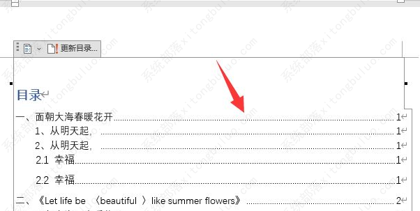 1、建立目录,在word中,实际上如果是通过“参考-目录”来自动生成的目录,在目录与页码之间默认都会有小点点,无需手工输入。