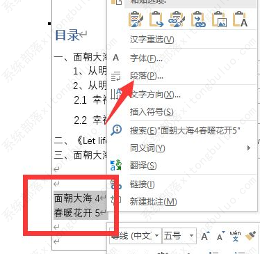 2、进入段落设置,若要手动设定目录,输入目录内容并选中后,请右击鼠标,然后点击“段落”。