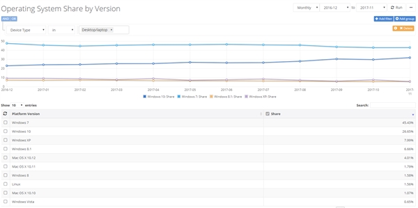 NetMarketShare的最新统计数据显示,截止11月底,Windows 10在桌面系统中的份额已达31.95%,一个月就增加了约2.1个百分点,对比年初更是高了近9个百分点。