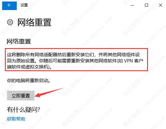 4、网络重置,会有段说明:这将删除所有网络适配器然后重新安装它们,并将其他网络组建设回为原始设置。确定没问题后,再点击【立即重置】即可。