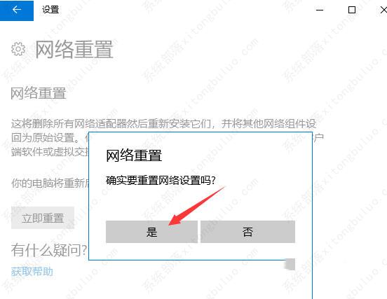 5、点击后,系统会弹出确实要重置网络设置吗?提示界面,点击【是】,会删除当前电脑中所有网络设备的驱动,然后重新安装。