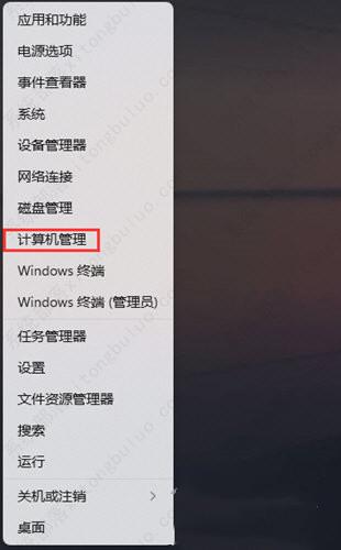 1、首先,按键盘上的【Win + X】组合键,或右键点击任务栏上的【Windows开始图标】,打开的隐藏菜单项中,选择【计算机管理】。