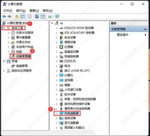 2、计算机管理窗口,左侧点击【系统工具】>【设备管理器】,然后在右侧,找到并点击【网络适配器】。