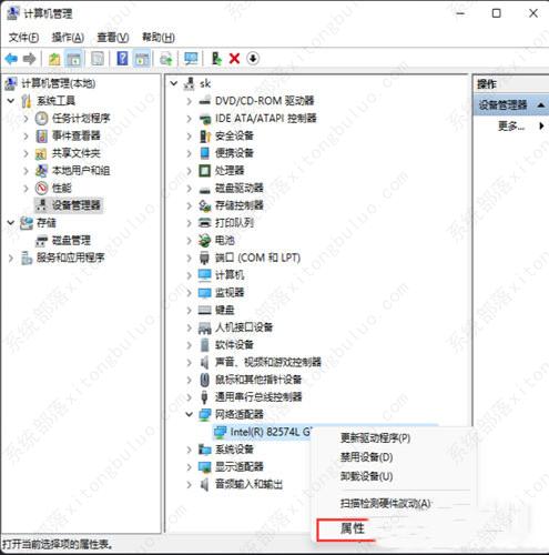 3、展开网络适配器后,找到网卡设备,选择后点击【右键】,接着在打开的菜单项中,选择【属性】。