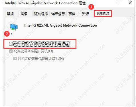 4、网卡设备属性窗口,切换到【电源管理】选项卡,【取消勾选】允许计算机关闭此设备以节约电源,然后点击【确定】。