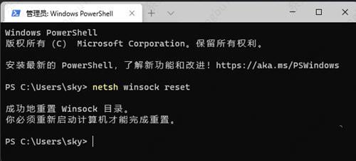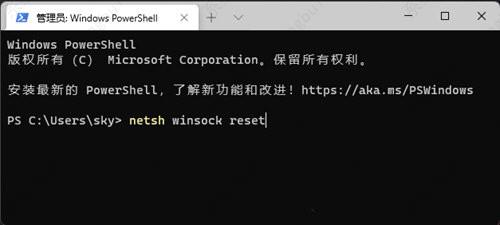 2、管理员:Windows PowerShell 窗口,输入并按回车执行【netsh winsock reset】命令。
