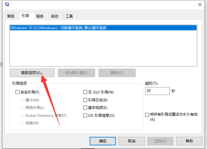 3、 在引导选项卡中,有一个高级选项的按钮,我们可以从这里来设置处理器的核心数量,点击高级选项。