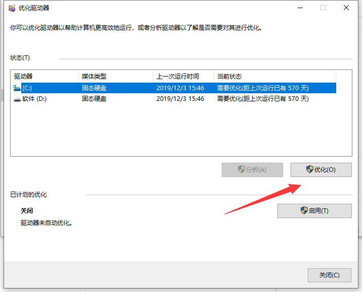 2、在优化驱动器页面中,点击C盘,点击“优化”。