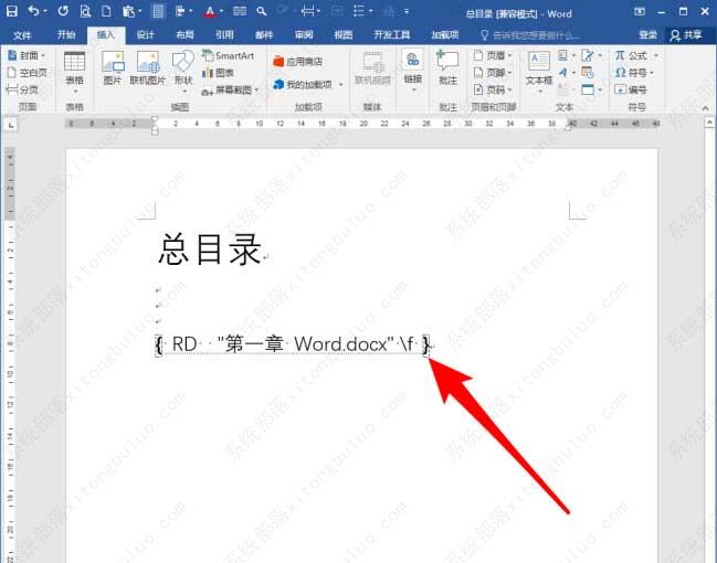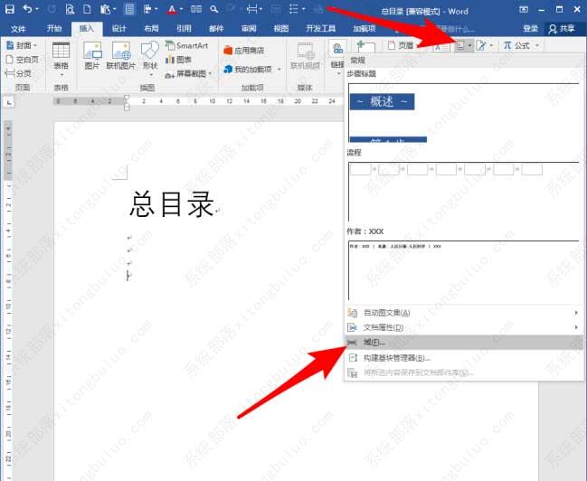 进入到总目录文档中,点击【插入】【文档部件】【域】。