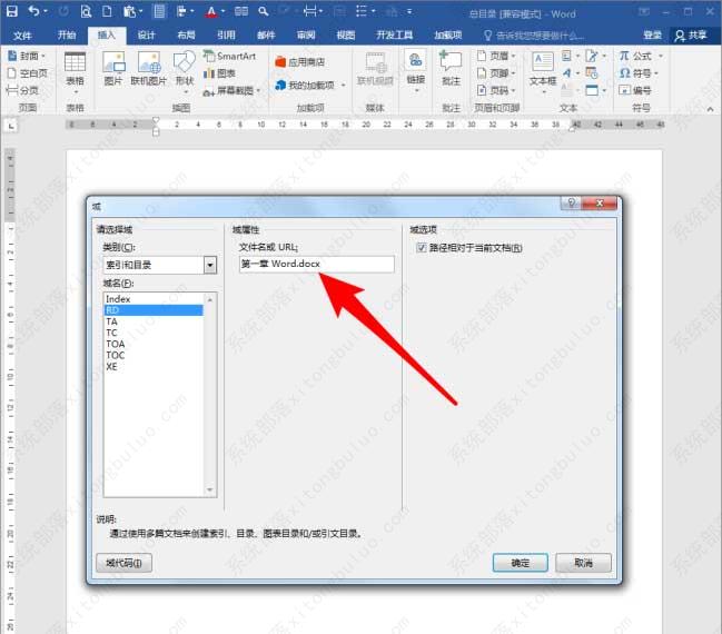 然后在【文件名或URL】中,输入第一章子文档的文件名,以及文件扩展名,即【第一章 Word.docx】。