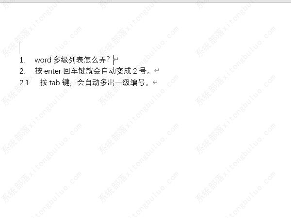 3、按enter回车键就会自动变成2号。按tab键,会自动多出一级编号。