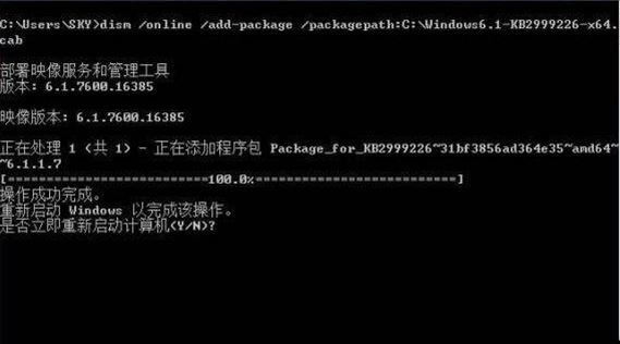如图:(蓝字为cab补丁包路径,cmd.exe需要用管理员权限运行),安装完需重启电脑。