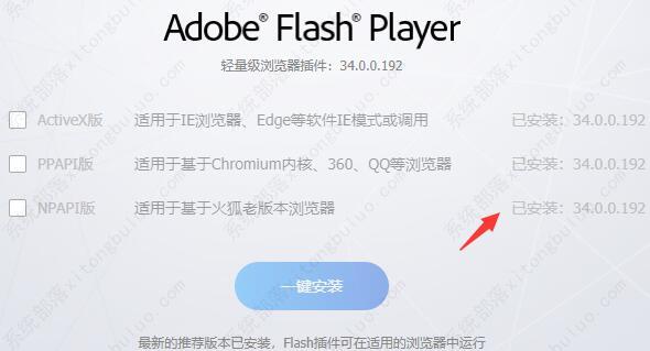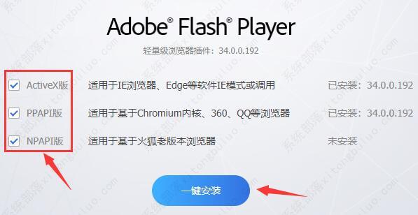 3、接着勾选上其中所有需要的flash版本,点击“一键安装”。