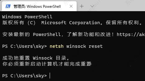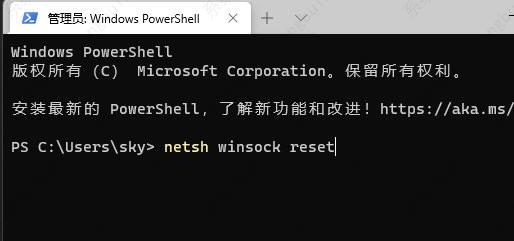 2、管理员:Windows PowerShell窗口,输入并按回车执行【netsh winsock reset】命令。