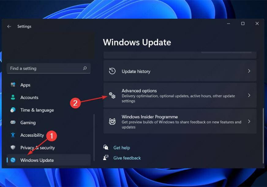 按 Windows + I 打开 设置应用程序,然后从左侧面板单击Windows 更新,然后单击右侧的高级选项。