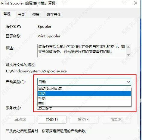 5、Print Spooler 的属性(当地计算机)窗口,先点一下终止,再点一下启动;
