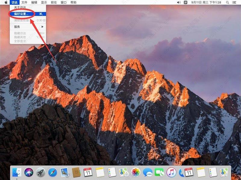 2、在打开的访达菜单中,点击选择“偏好设置”。