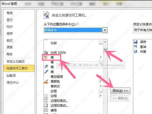 2、在从下列位置选项命令中选择所有命令,找到笔符号,选定后单击添加按钮,点击确定。