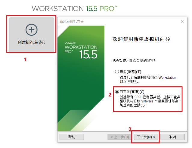 2、在 VMware 虚拟机中创建新的虚拟机,选择自定义并点击下一步。