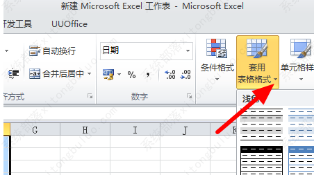 2、然后我们在开始子菜单栏中点击打开“套用表格格式”后面的倒三角形。