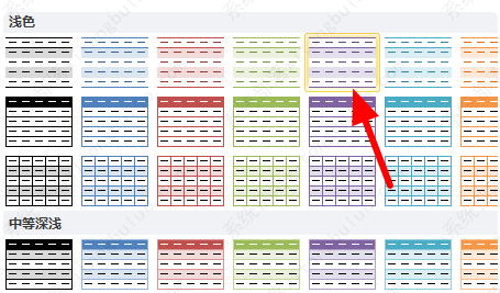 3、然后我们在弹出来的窗口中点击选择“浅色”中第一行第五个就是表样式浅色5。