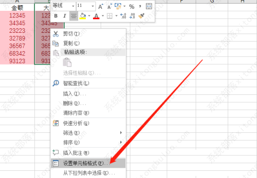 2、单击鼠标右键,在弹出的功能栏中选择设置单元格格式。