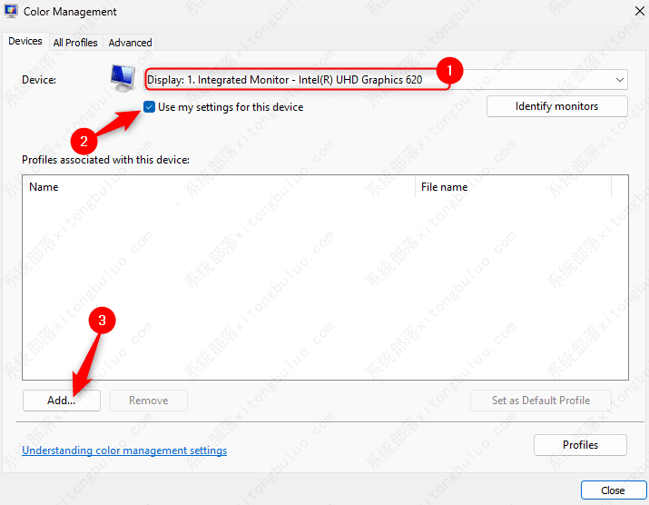 第 8 步,使用设备旁边的下拉菜单并选择您要为其重新安装颜色配置文件的显示器。