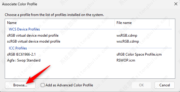 第 11 步,在关联的颜色配置文件窗口中,单击浏览按钮。